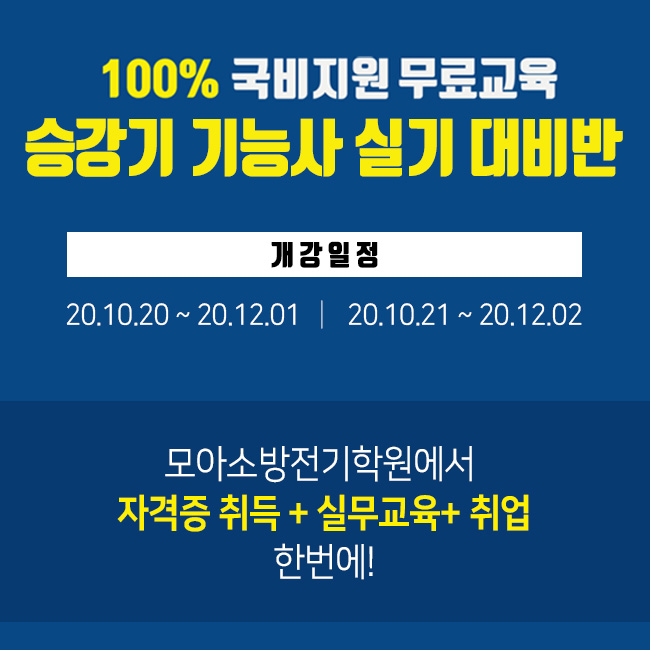 모아에서도 승강기 기능사 실기 대비반을 운영합니다. 평일 오후 13시 ~ 16시까지 운영됩니다. 시간 참고해 주세요. ^^ 국비지원으로 운영되니 내일배움카드가 있으신분들은 승강기기능사에 도전해 보세요. 자세한 사항은 모아전기학원으로 연락주시면 상세하게 상담 드립니다. ^^