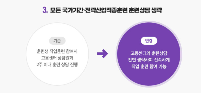 모든 국가 기간 , 전략산업직종훈련, 훈련상담을 생략합니다. 기존에는 훈련생이 직업훈련 참여시 고용센터 상담원과 2주 이내에 훈련상담을 진행해야 했던 반면에 변경된 규정은 고용센터의 훌련 상담을 전면 생략하고 빠르게 직업 훈련에 돌입할수 있도록 합니다.