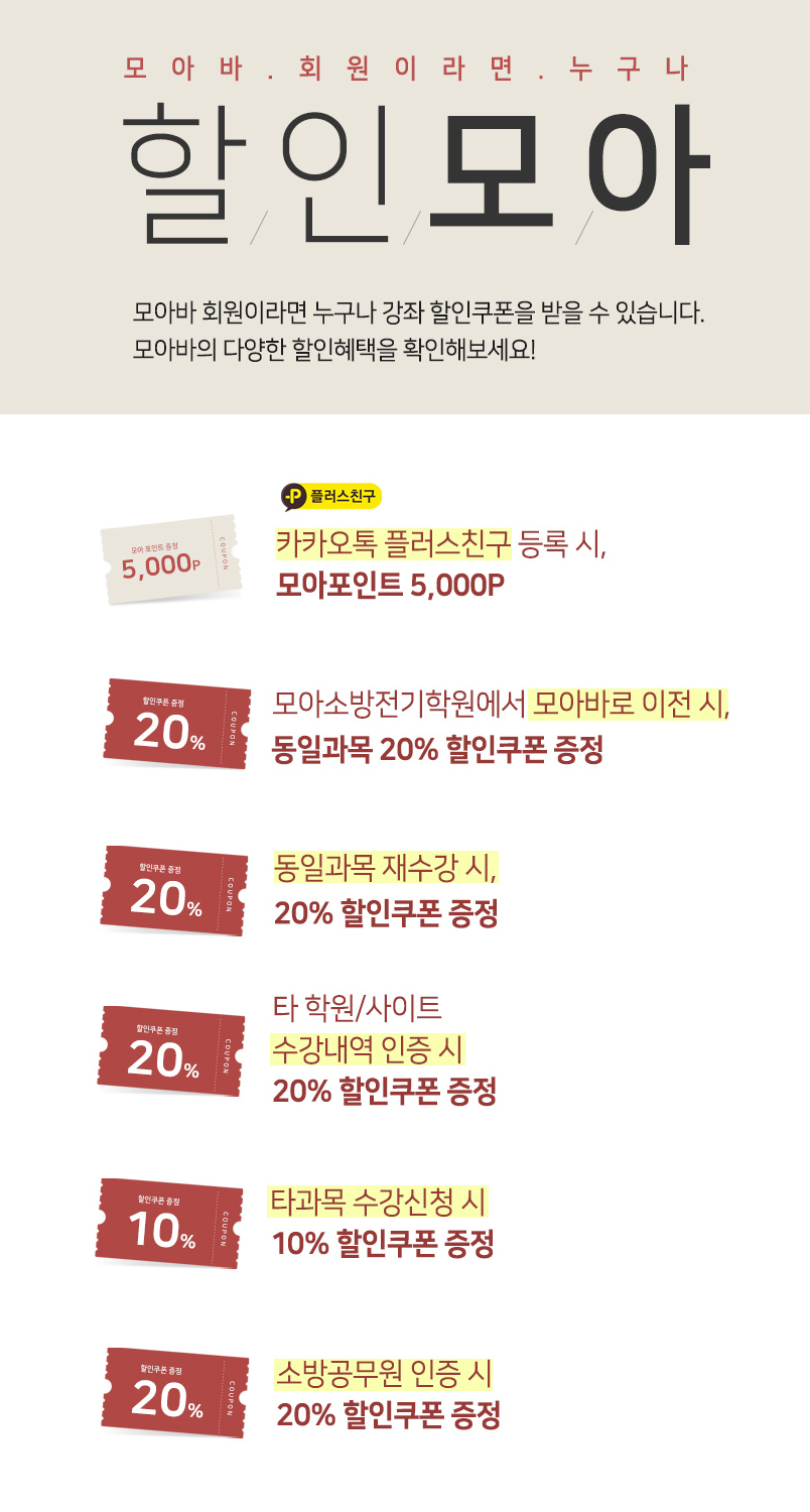 모아바는 소방/전기 자격증 전문 인강 사이트로서 여러분들에게 최상의 강의를 제공하고 있습니다. 여타 강의와는 차원이 다릅니다. 발 빠르게 최신의 강의를 제공해 변화하는 시험 트렌드에 여러분들이 빠르게 적응하고 적용할 수 있도록 합니다.