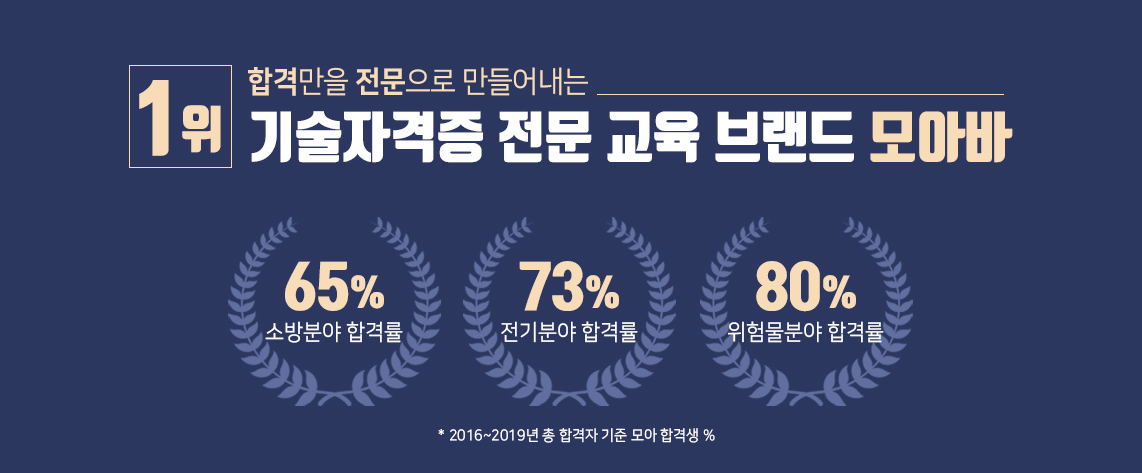 모아의 소방자격증 합격률은 다른 학원, 다른 인강의 합격률과는 차원이 다릅니다. 모아의 소방분야 합격률은 65%입니다. 자격증 별로 나눠보면 소방기술사는 50%, 소방시설관리사는 57%, 소방설비기사는 89%입니다. 이런 합격률은 어딜 가서도 찾아볼 수 없는 수치입니다. 매년 많은 분들이 모아에서 자격증을 취득하고 있습니다. 모아의 노하우는 날이 가면 갈수록 늘어나고 합격률은 높아지고 있습니다.