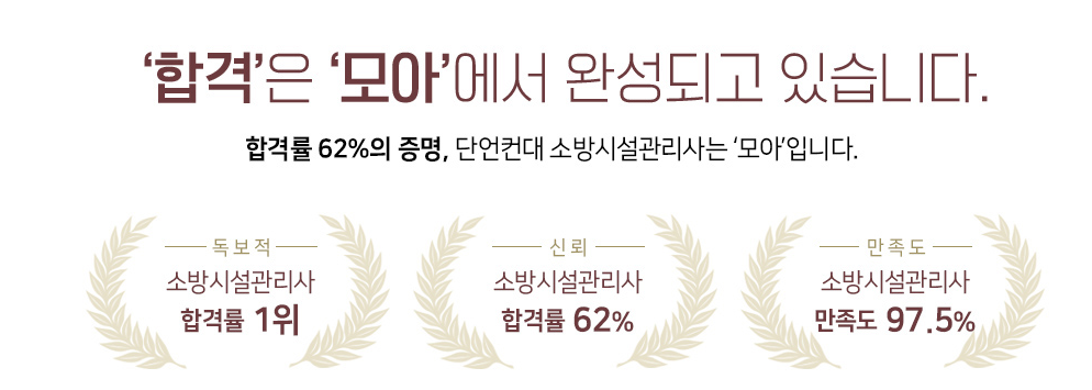 소방시설관리사 1차 합격에 대한 계획부터 관리까지 "합격" 할 수밖에 없는 모아의 독보적 합격프로그램 하나면 2021년 소방시설관리사 합격도 어렵지 않습니다. 합격 집착! 모아의 보람은 여러분들의 합격입니다.