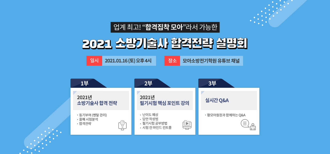 올해 소방기술사 필기 시험은 1월 30일 / 5월 23일/ 7월 31일 입니다. 오늘 기준으로 123회 소방기술사 필기시험까지는 22일 남았습니다. 2021년의 첫번째 시험을 앞두고 계신 분들이라면 막바지 최종 정리를 해보고 계실것 같네요. 모아도 시험 전에 어떤 식으로든 여러분께 도움이 되고자 이번 라이브 설명회를 준비하였습니다. 그간 소방기술사 합격전략설명회는 모아소방학원에서서 사전 접수하신 분들께 모아의 숨은 노하우를 전수하는 방식으로 진행되었습니다. 하지만 이번 2021년은 보다 많은 분들에게 모아의 합격 노하우를 전달하고자 자리를 마련했습니다.