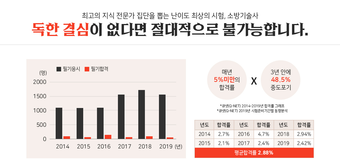 소방기술사는 독한 결심이 아니면 합격 할 수 없는 자격증입니다. 소방기술사는 독학으로 합격하기 너무나도 어려운 자격증입니다. 누군가의 조언과 학습을 위한 추가적인 자료들이 없다면 합격하기 힘든 시험입니다. 소방기술사는 한회에 10명 내외으로 합격하는 어려운 시험입니다. 그런 와중에 모아의 소방기술사 합격률은 46% 지금 이순간 이 글을 보고 있는 여러분은 언젠가 소방기술사에 합격 하겠지만 모아와 함께 하시면 그 영광의 순간이 더 빠르게 다가 올 수 있습니다.