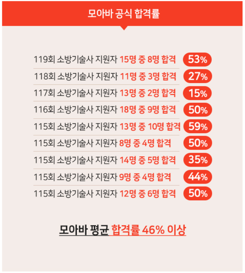소방기술사의 정년은 없다고 표현할 수 있을 정도로 제한이 없습니다. 원하는 날까지 기술사로서의 역할 수 있습니다. 이보다 더 좋은 자격증이 있을까요? 게다가 모아의 안에서 소방기술사 합격을 하는 분들은 전체 합격자의 절반 정도 됩니다. 이것은 정말 놀라운 수치입니다. 그만큼 자타공인 모아는 소방기술사 합격의 명가라는 말입니다. 이는 자만하는 것이 아닙니다. 소방기술사에 대해서 조금은 알아보신 분들이라면 다들 동의하실 것이라고 생각합니다. 모아는 여러분들의 합격을 위해 앞으로 나가갈 뿐입니다. 모아를 믿고 따라와 주세요. 모아는 여러분들의 합격이 보람이 됩니다.
