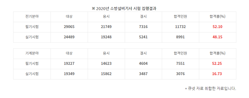위의 표는 큐넷 자료를 취합하여 정리 한 2020년도 시험 집행 결과입니다. 첫번째 표가 전기분야 시험 집행결과 이고 두번째 표가 기계분야 집행결과입니다. 전기분야가 응시자수가 훨씬 많고 합격률 또한 높습니다. 그만큼 전기분야를 많이 취득하고 합격도 기계분야 보다는 수월하게 취득할 수 있습니다.